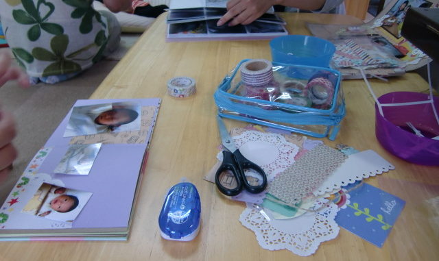 スタッフが内職作業で準備した(笑)アルバムに、各自持参した子どもさんの写真をシールやマスキングテープを使ってセンス良く貼っていきました。