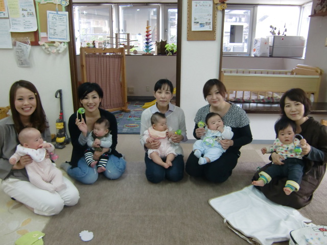 できたおもちゃを手に赤ちゃんたちもさっそくナメナメして遊んでいました。
