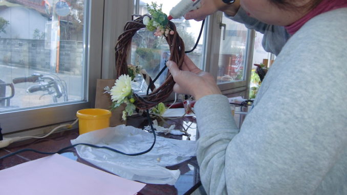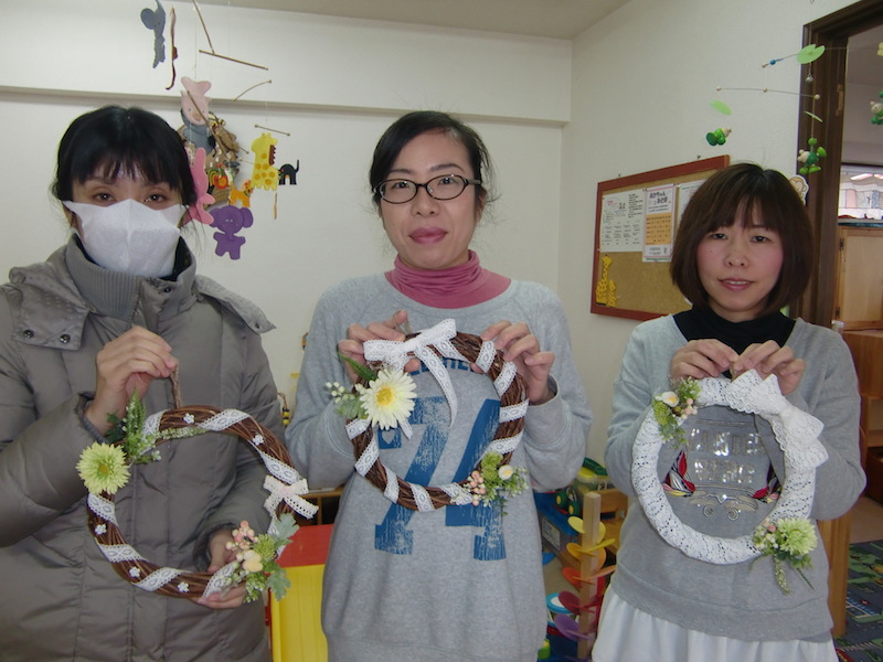 準備してもらった材料で、お母さんたちが自由にアレンジ、とても素敵な春のリースに仕上げておられました。