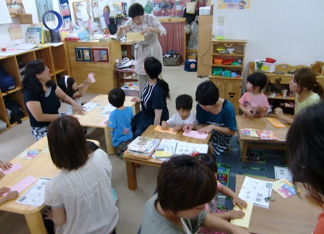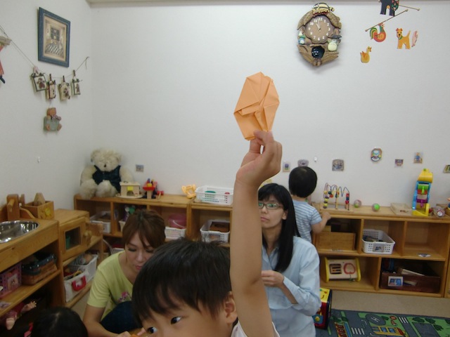 9組の親子とスタッフで日本の伝統的な遊び、折り紙をしました。