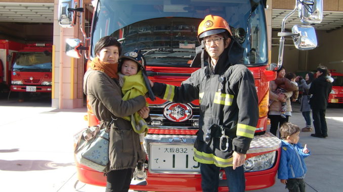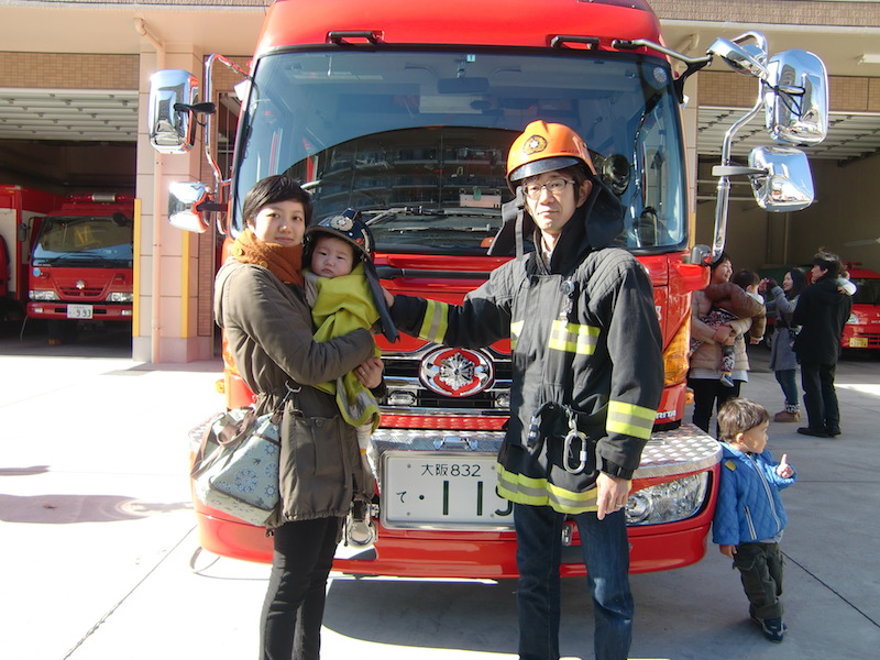 大好きな消防車の前で憧れの消防士さんのコスチュームを着て、パパと一緒にハイ、ポーズ!