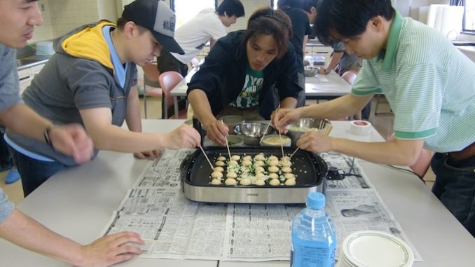 みんなで2台のホットプレートに向かって、たこ焼きを作りました。