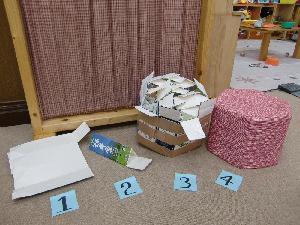 24枚で六角形を作り、新聞紙を中に詰め込み、ダンボールで周囲を巻き込むまでの工程を、2時間で終了しました。