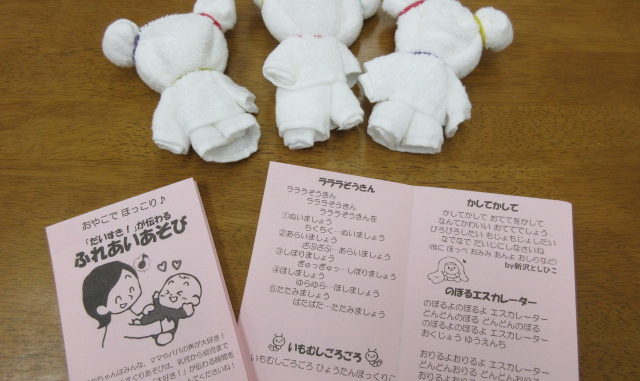 タオルハンカチで、ペンギン(に見立てたヒヨコ)やクマのぬいぐるみを作って、手遊び歌を楽しみました。