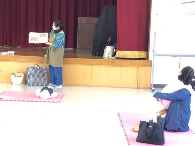 ママやパパのむけて、絵本「すきなこと にがてなこと」の読み聞かせ。