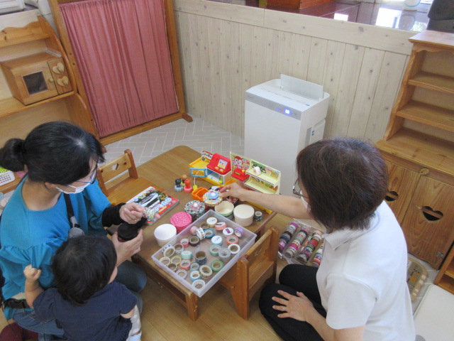 上に付けるフェルトの花の色も子どもに聞いたり、お母さん同士で「こっちの色が可愛いですね」等アドバイスしたり、してもらったりしながら、完成!
