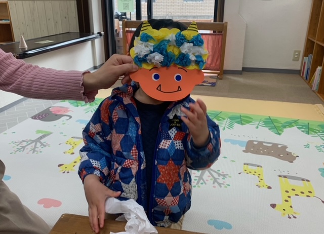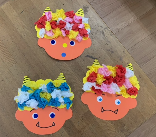 学生さんと一緒に、おはながみを丸めて鬼のお面や豆を作って豆まきを楽しみました。