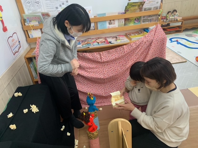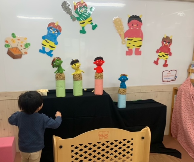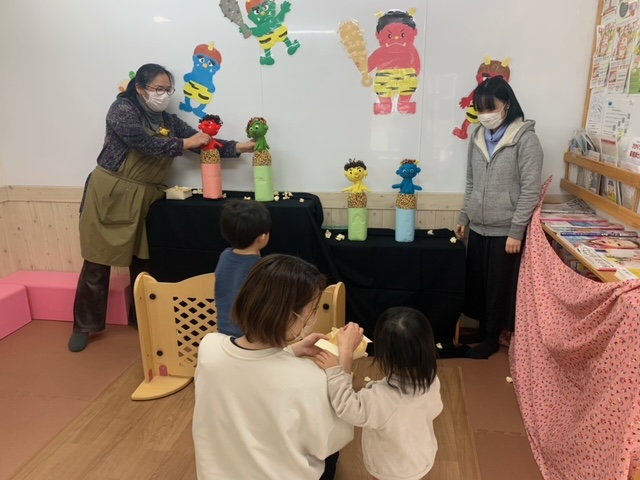 製作を楽しんだ後は、作った豆を鬼の人形に投げて豆まきを楽しんでもらいました。