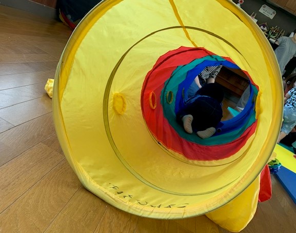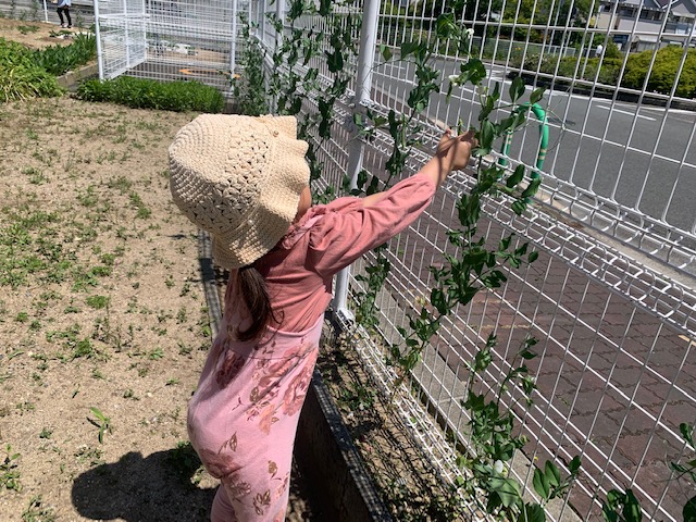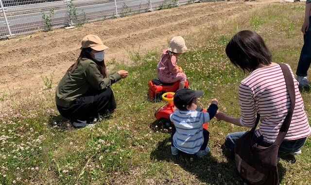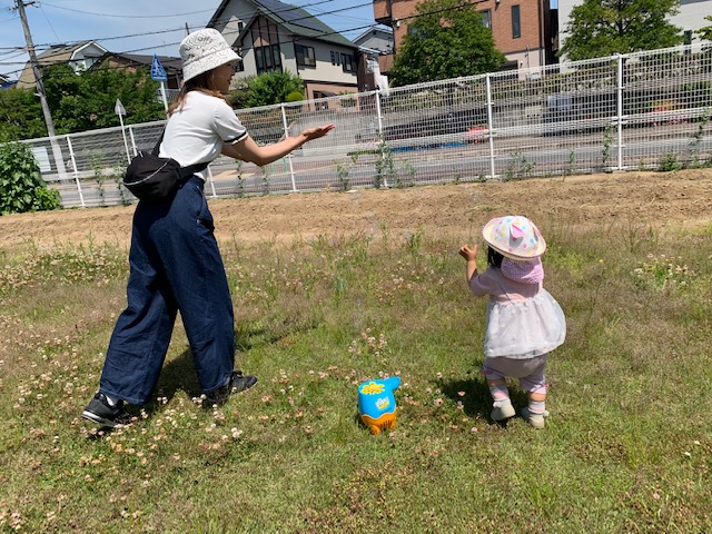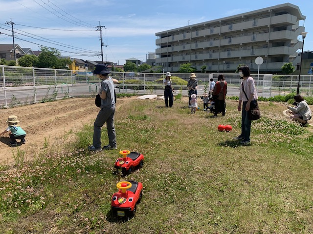 5月12日、普段は地域の方が主に交流の場として利用されている「らくらく亭」(三島丘府営住宅の旧集会所)をお借りして遊びました。集会所の敷地内にはシロツメクサが咲いていたり、四つ葉のクローバーがたくさん見つかる場所があったり、フェンスで囲まれているので道路に飛び出す心配もなく安心して遊ぶことが出来ました。とてもいいお天気だったので、シャボン玉を飛ばすとママもお子さんと一緒に「わぁ、きれ~い!」と喜ばれていました。集会所の中にはスタッフがトンネルやボールを準備していたので、普段ひろばではできない身体を動かす遊びを楽しんでもらいました。利用者さんが育てているエンドウ豆も「とっていいよ」とおっしゃってくださり、収穫も楽しむことが出来ました。地域の高齢者の交流の場の「らくらく亭」ですが、今後もこえんひろばは利用させていただく予定です。その時にはぜひ遊びに来てくださいね。