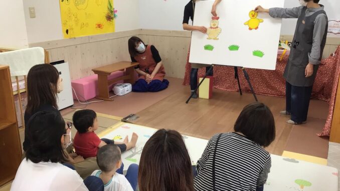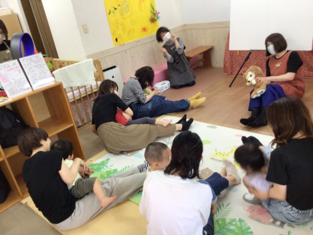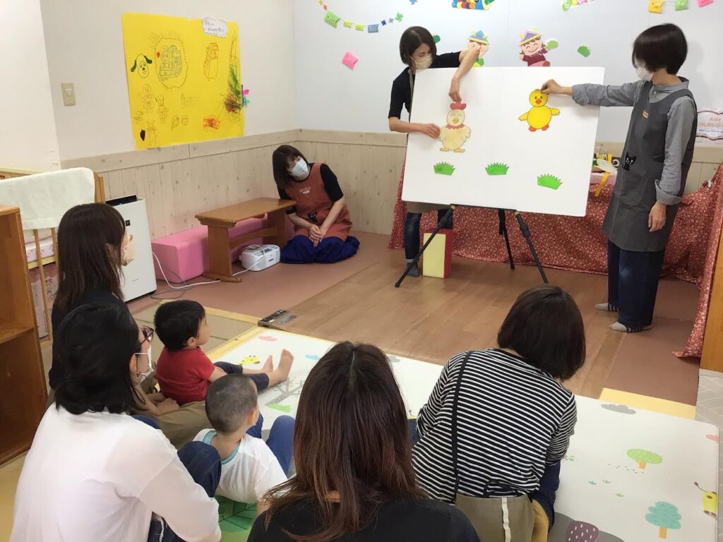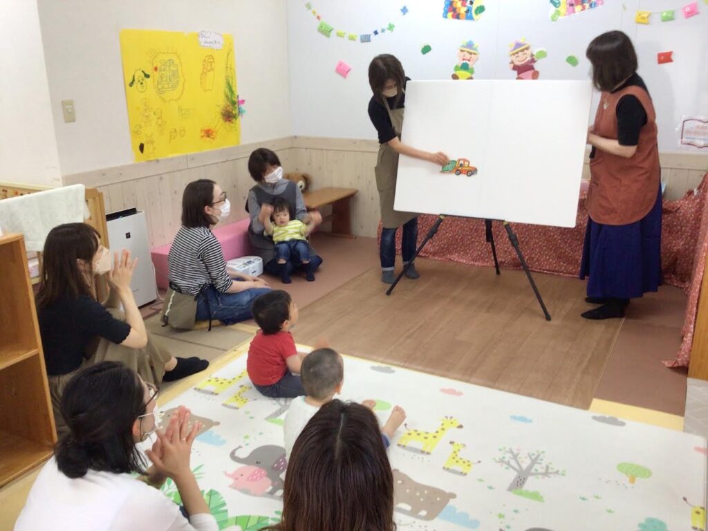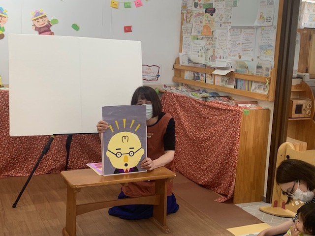 5月17日 ひろばで「おたのしみ会」をしました。アンパンマンの手遊びや「ひよこちゃん」や「はたらくくるま」のパネルシアターを楽しみました。「一丁目のどら猫」のエプロンシアターでは、ねずみが猫に追いかけられるところをみて、子どもたちは声を出して大喜び!ほかにも、「ぼうしをとったら」の絵本や「バスに乗って」のふれあい遊びを一緒に楽しみました。久しぶりの「おたのしみ会」でしたが、ママのひざの上の子どもたちの笑顔がとても素敵で、私たちも嬉しいひと時でした。