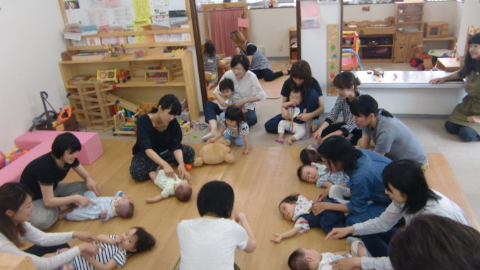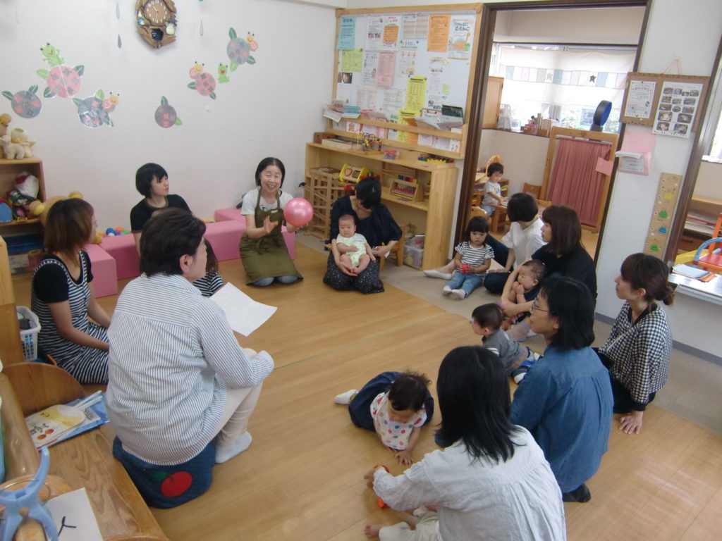 バスタオルを使って、『ゆさぶり遊び』をしたり、子どもの手をもって、『日本橋こちょこちょ』、『お茶つぼ茶つぼ』、子どものほっぺたをツンツンしながら『ここはとうちゃんにんどころ』など他にもいろんなわらべうたを歌いながら、みんなでふれあいをして楽しくすごしました。