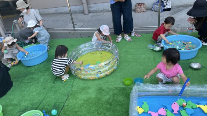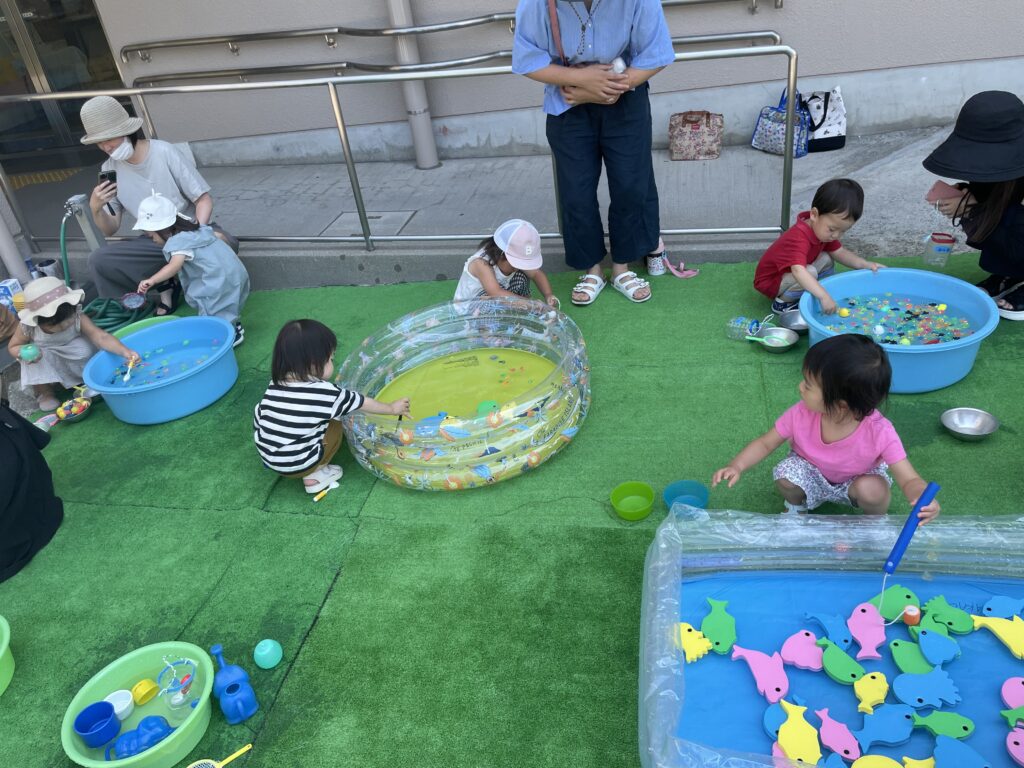 7月「水で遊ぼう」 2023年7月27日 koenhiroba 地域の人たちと 0 7月21日に『水で遊ぼう!』をしました。 金魚すくいや魚つり、ペットボトルシャワーなどで遊びました。 お天気も良く子ども達は、とても気持ち良さそうに水の感触を楽しんでいました。