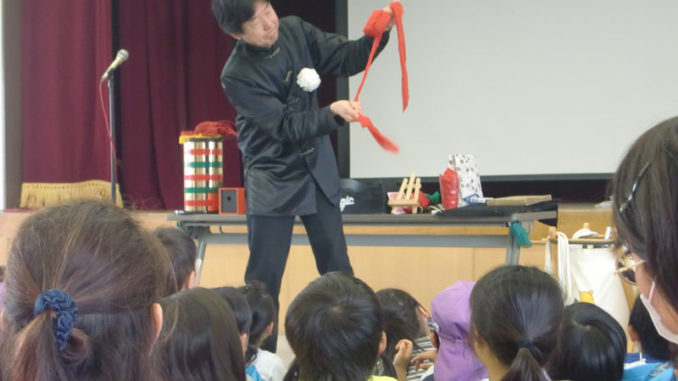 先生を中心に生徒さんにも加わって手品をみせてもらいましたよ。