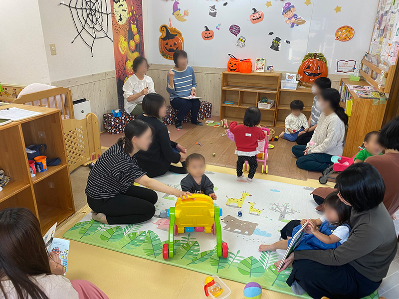 「子育てサポート:グランマふみ」のおふたり(亀田さん・成田さん)にこえんひろばで「子育てで大切にしたいこと」を参加者さんと日頃の困りごとやエピソードを話したり聞いたりして話し合いました。
