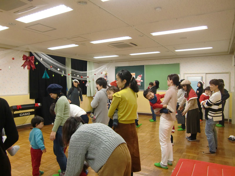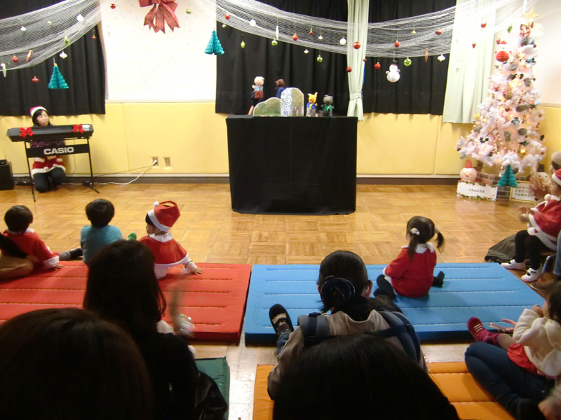 親子で一緒に「アヒルのダンス」、スタッフによる人形劇のあとは、お待ちかねのサンタクロースが鈴の音にのって登場!