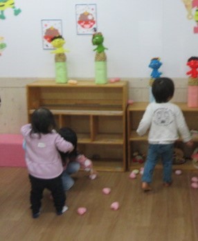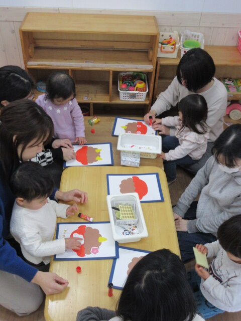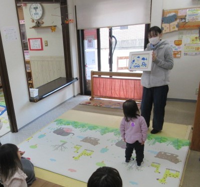 手あそびやスケッチブックシアター、鬼の的当てゲームを、学生ボランティアのももかお姉ちゃんとたのしみました。