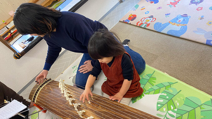 子どもたちも、指で弦を引っ張たり、ママと一緒に楽しそうに琴の音色に触れていました。