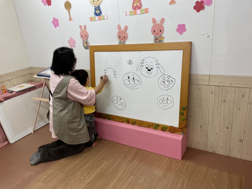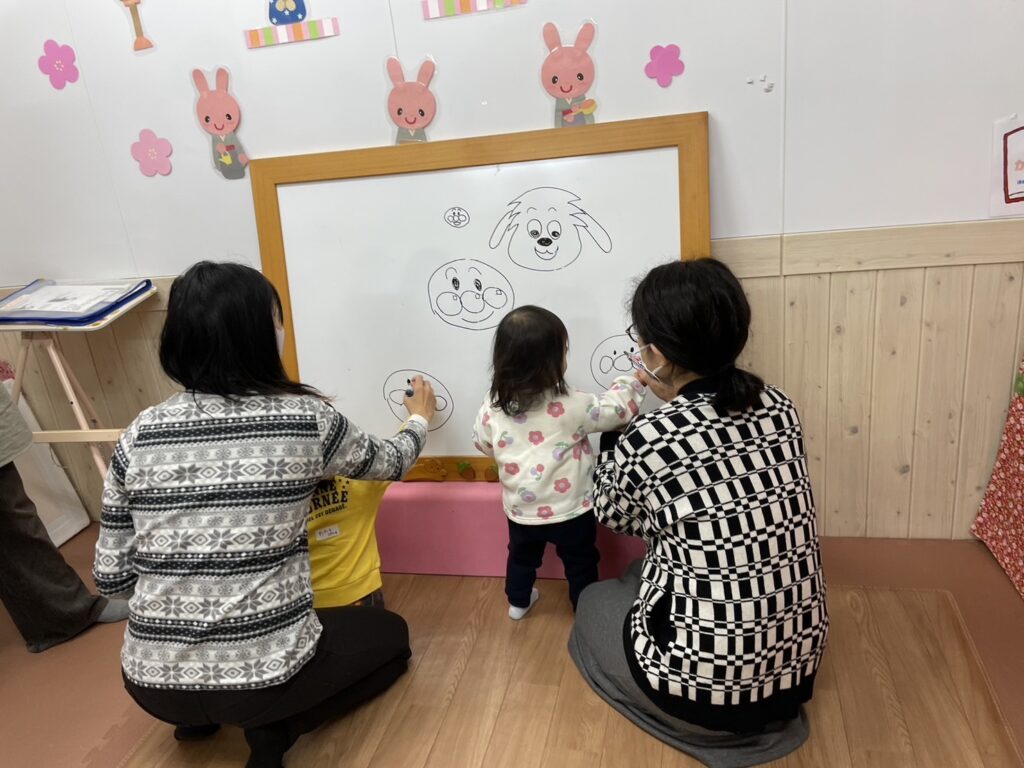 わんわんのえかき歌を紹介したあとは、親子でアンパンマンにチャレンジ。