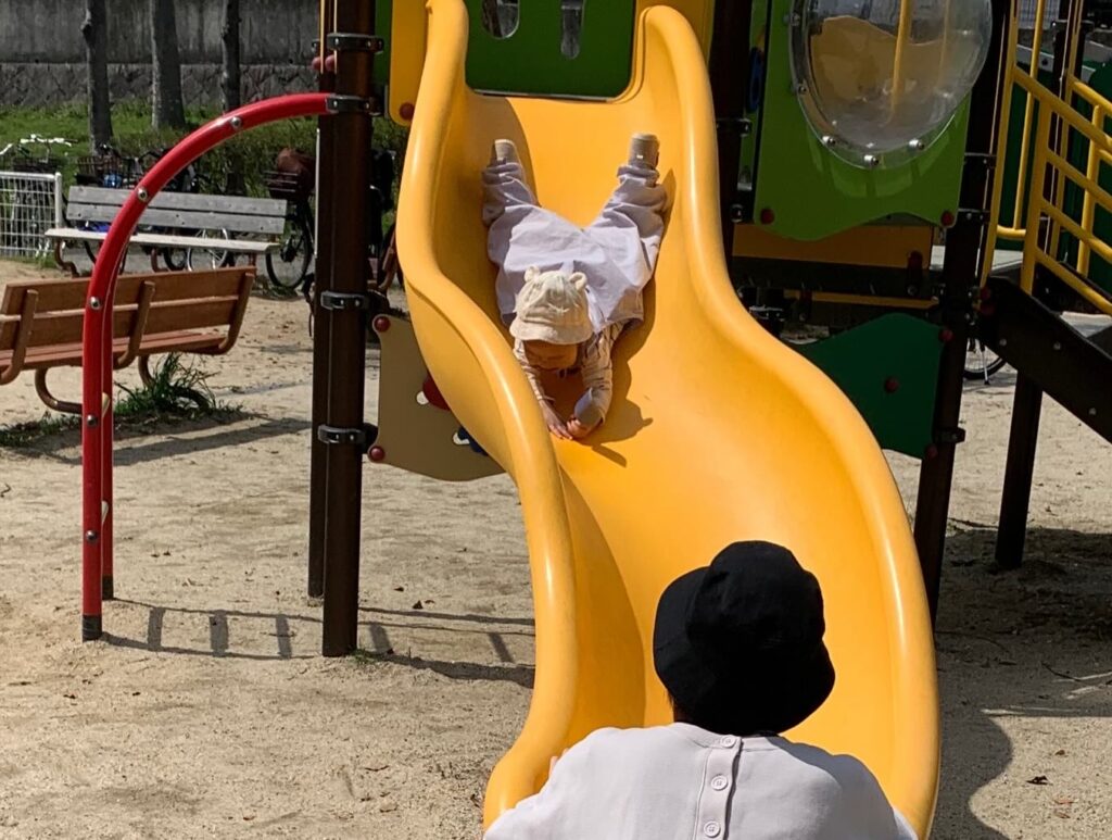 初めてお砂遊びする赤ちゃんもいたり、ママと一緒にブランコに乗ったり…😊滑り台では、頭から滑ってくる赤ちゃんも!すごい度胸❣️
