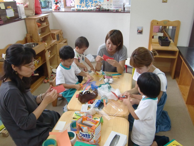 保育士志望の大学生のお姉さんが、身近なお菓子の空き箱や折り紙を使って「親子で作るお弁当」を教えてくれました。