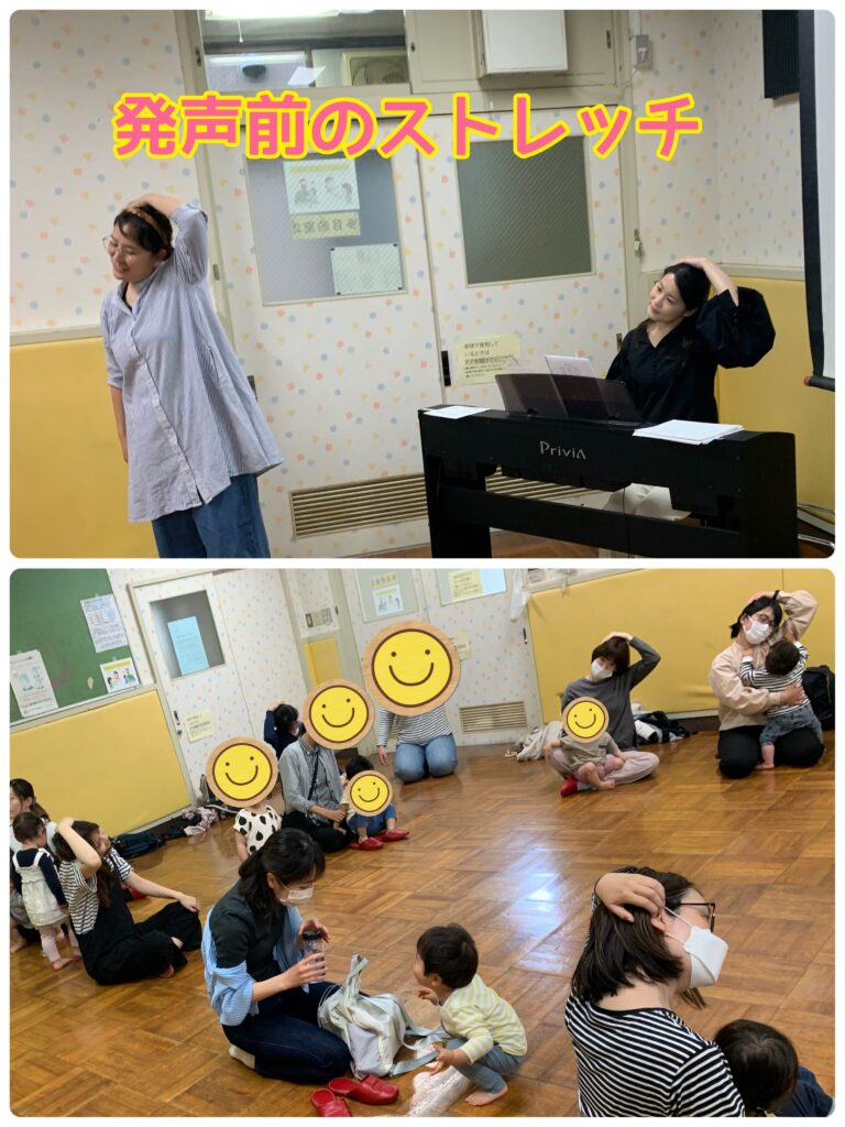 今回の講座の最大の目的は、「ママが歌を楽しむ」こと❗️発声練習で腹式呼吸の方法を教えていただき、お腹から声を出す練習もして歌を歌いました🎶もちろん、子どもも楽しめるように歌に合わせて身体を動かしたり、手遊びしたりと盛り沢山の内容でした。