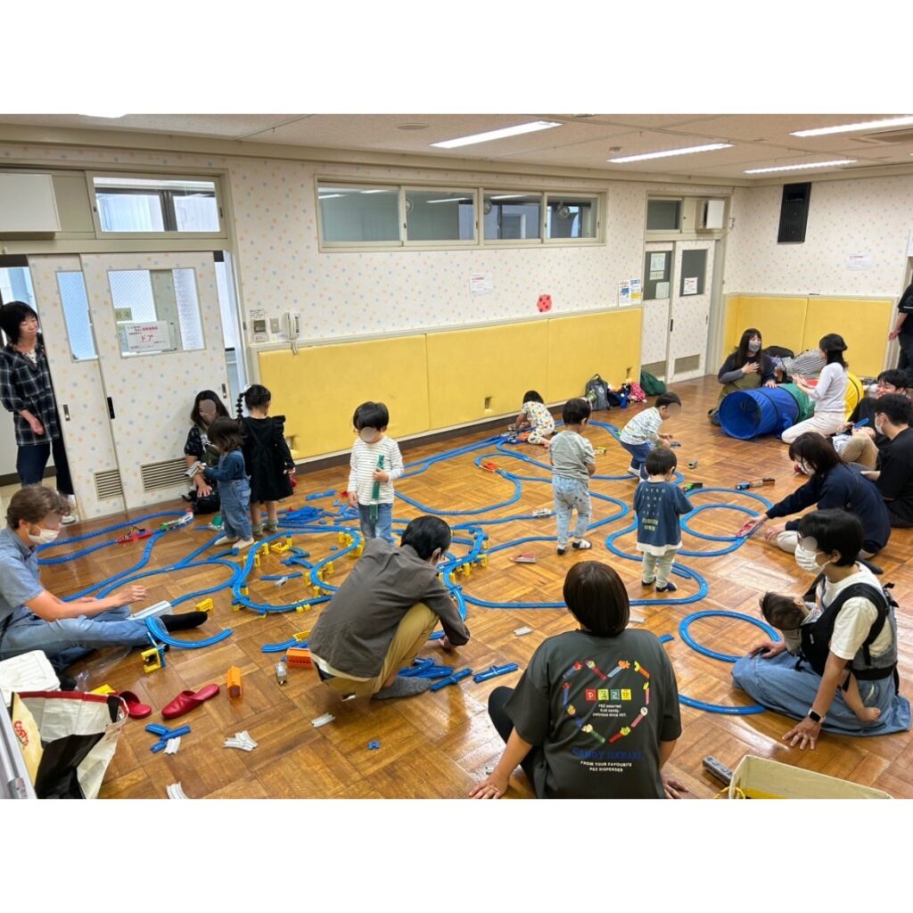 総持寺いのち愛夢センターの多目的室をお借りして、お部屋いっぱいに線路を繋げて巨大プラレールを作りました。
