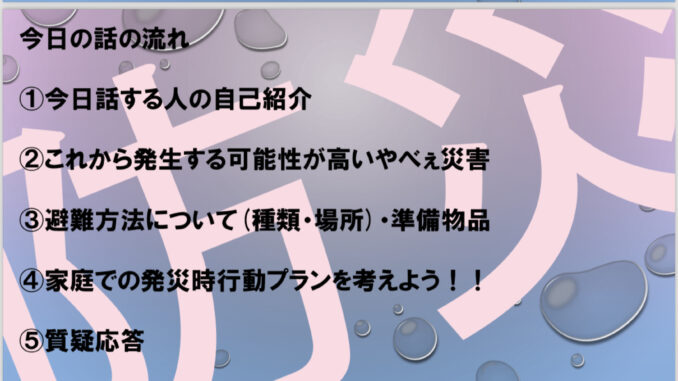 今回は防災の話を保健師の友末さんにしていただきました。実は防災の事にも詳しい友末さん。今の時点で考えられる災害の予測から、災害時の避難場所はどこ?や災害時の知っておくと安心なサイトなどの紹介をして下さいました。
