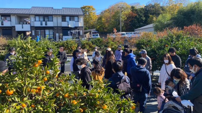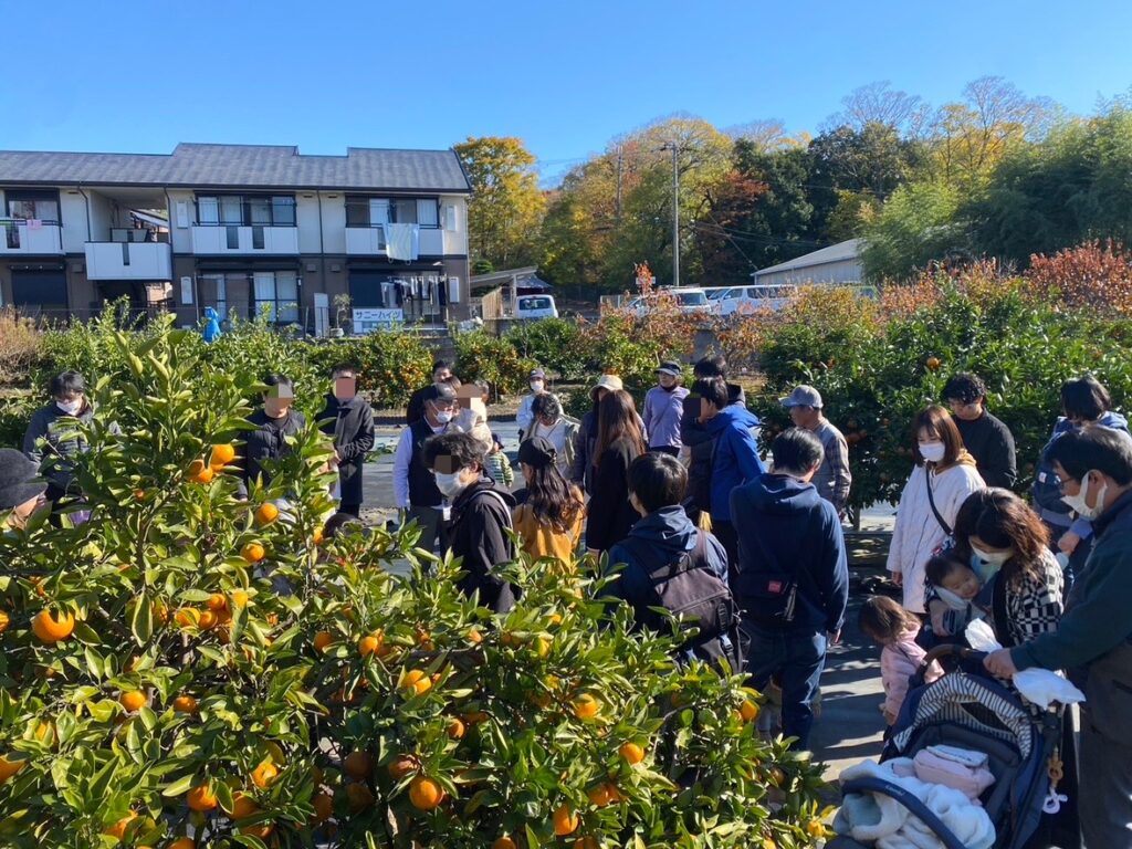 畑のボランティアさんに、みかんの収穫の仕方や美味しいみかんの見分け方などを教えて貰った後、親子でみかん狩りを体験しました。