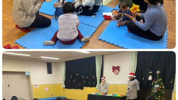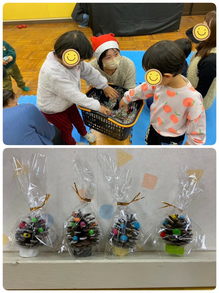 こえんひろばのクリスマス会🤶今年もふみふみさんが来てくださり、ハンドベルの演奏や、ふみふみさんお手製のパラバルーンで親子みんなで楽しく遊びました。最後に手作りのプレゼントももらってニコニコ笑顔でした!