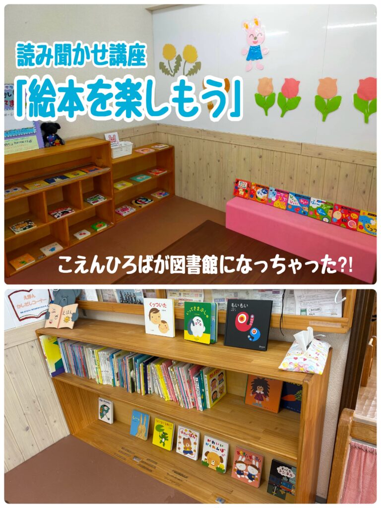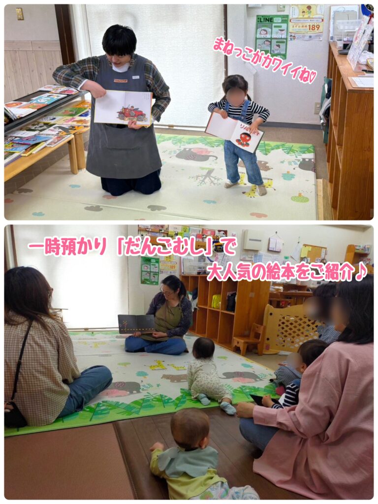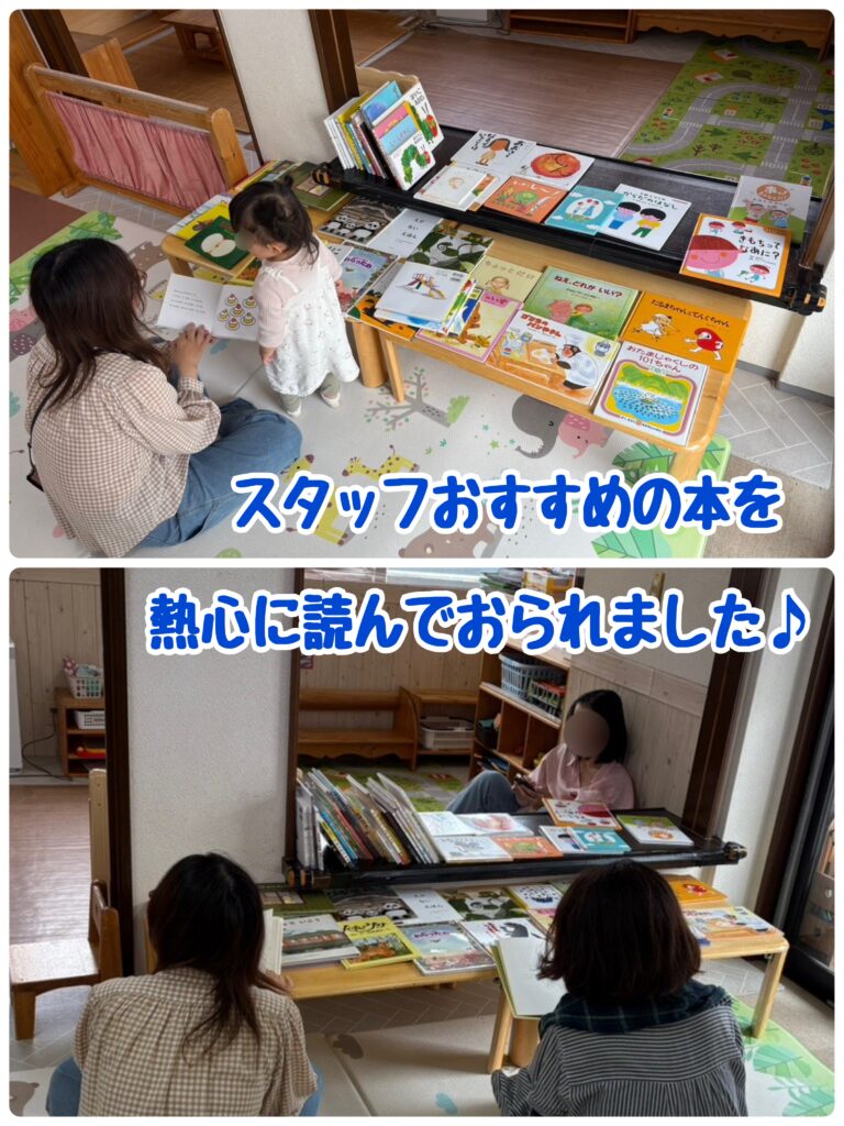 スタッフのオススメ絵本や、一時預かり「だんごむし」で人気の絵本などをご紹介しました。月齢別の絵本の選び方、ねんねの時のオススメ絵本などをご紹介したほか、対象月齢に対してお子さんが幼くても“見つけっこ遊び”や“まねっこ遊び”で楽しめる事など、絵本の活用方法や発達の効能などもお伝えしました。子ども達がおもちゃで遊び始めたあとも、ママ達は熱心にたくさんの本を手に取っておられましたよ。