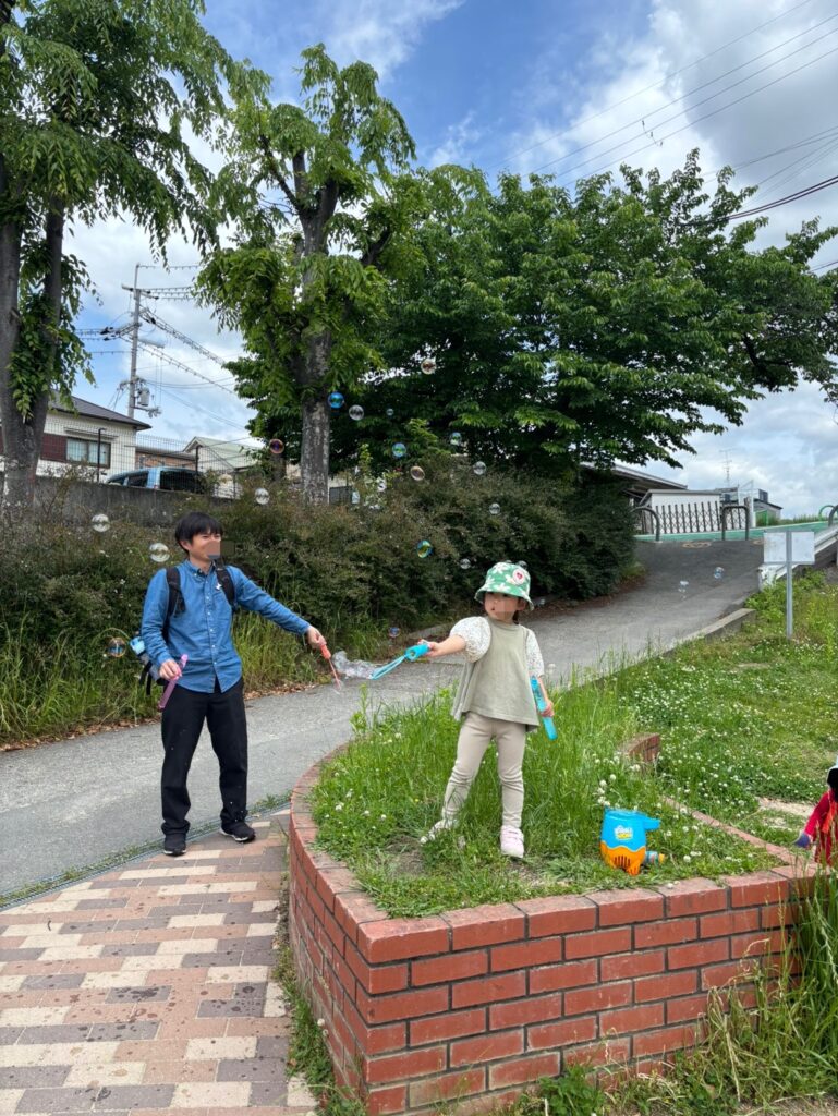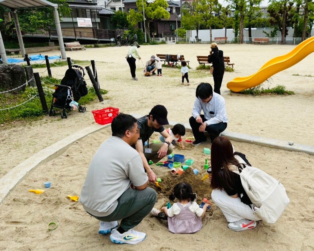 お天気に恵まれて、来られた親子とスタッフが通称「うさぎ公園」でシャボン玉やお砂場、遊具で一緒に遊びました。保健師の友末さんに、遊びながら子育ての相談やパパサークルの話しを聞いたり、楽しく過ごしました。