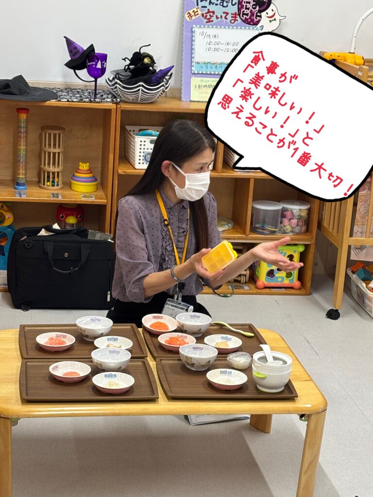 離乳食をこれから始めるママと少し始めているママの参加でした😊「食事が楽しい!」と思えることが大切❣️ママも一緒に食事をして、「モグモグ」「パクパク」等言葉に出して、美味しそうに食べることも大事なんだそうです😊