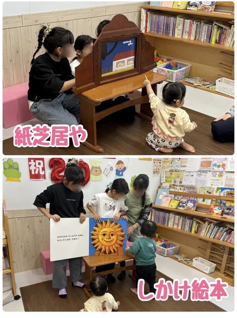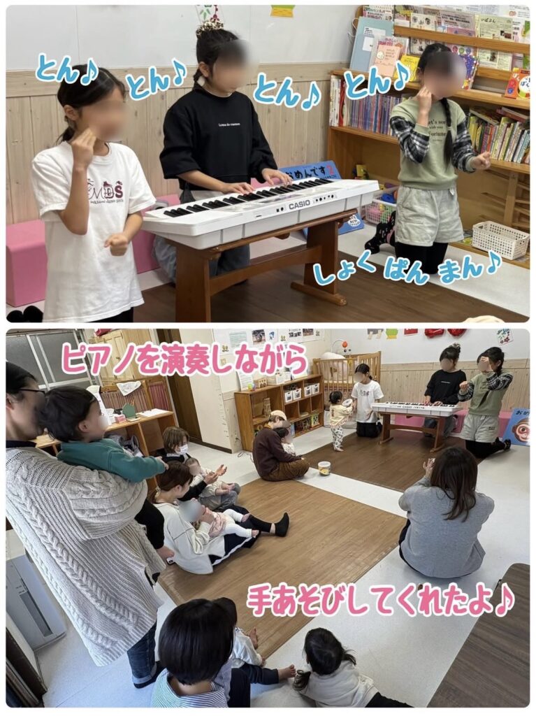 こえんひろばに小学4年生のおねえちゃん達が遊びに来てくれました。この日のために、3人で「何をしようか?」と色々相談してくれたみたいで、ピアノ伴奏付きの手遊びや紙芝居、絵本も読んでくれました♪また、遊びに来てくださいね!