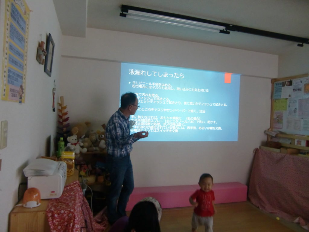 他にも液漏れをした場合は、直接触らず手袋をつけて対処すること、または、おもちゃ病院に預けたほうがいいことを教えてもらいました。