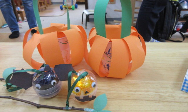 紙コップにオレンジの画用紙を貼って、かぼちゃのお菓子入れも作りました。