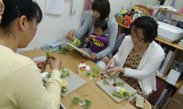 アートフラワーで三藤先生のご指導を受けながらステキなボードづくりにママ達が挑戦しました。